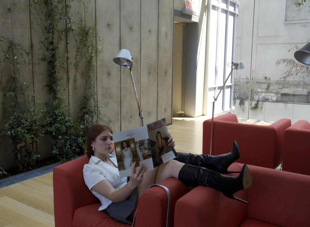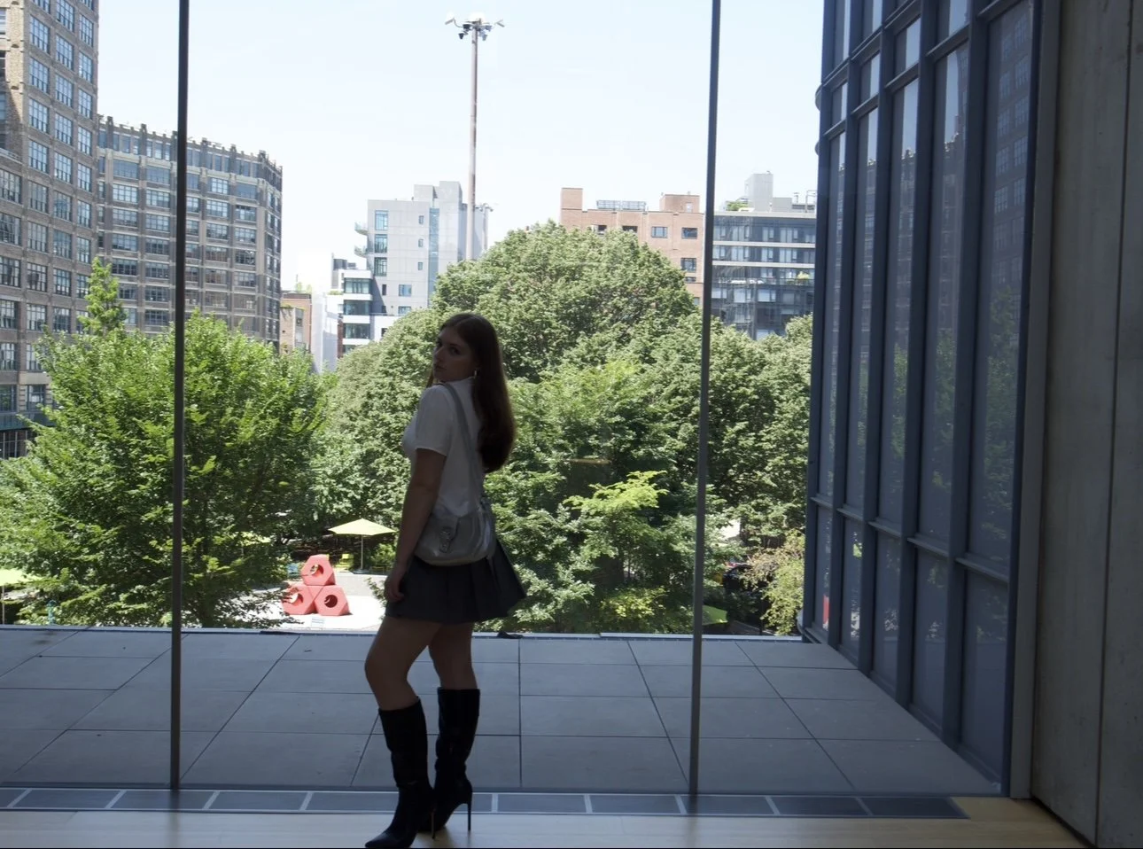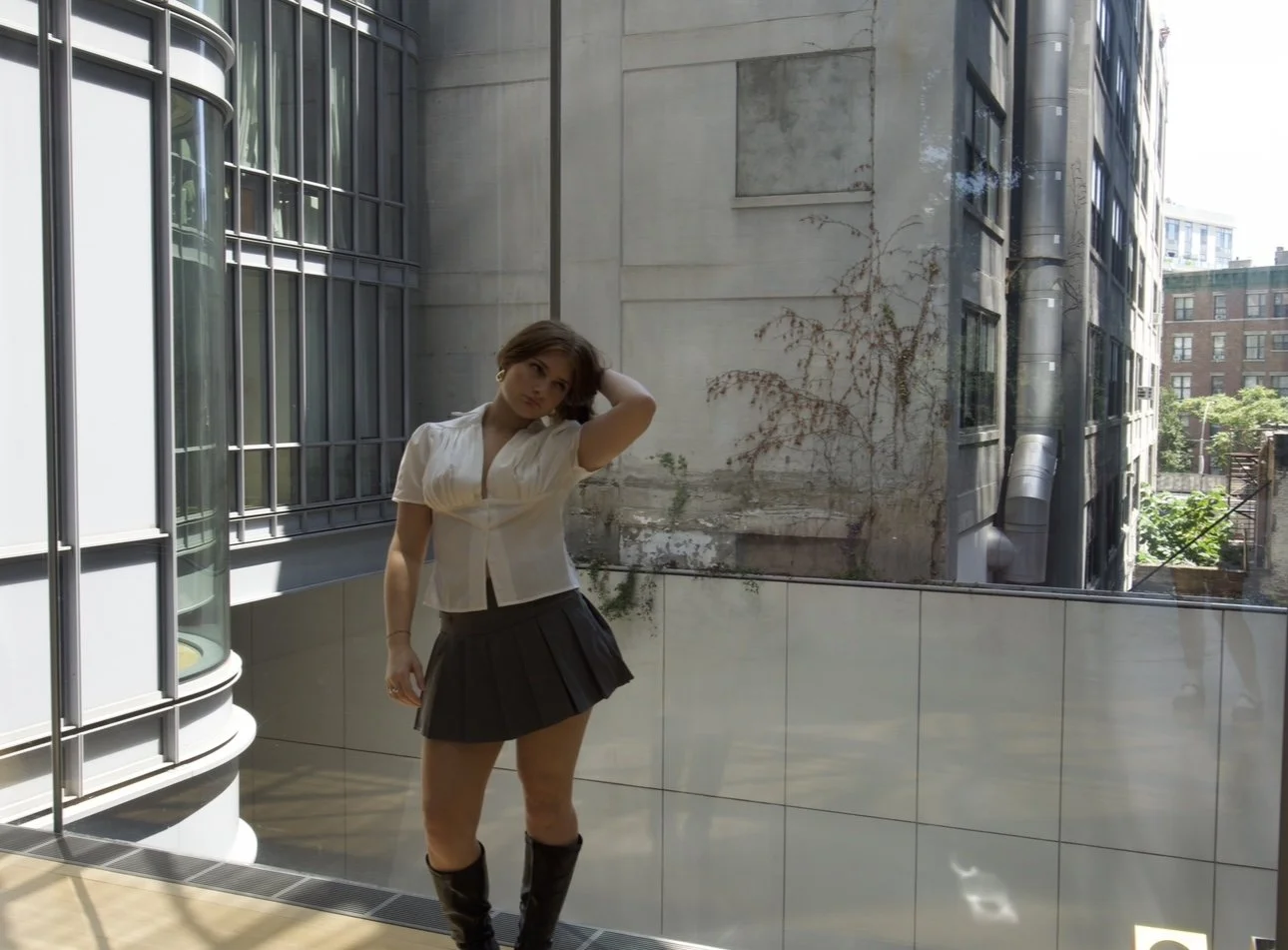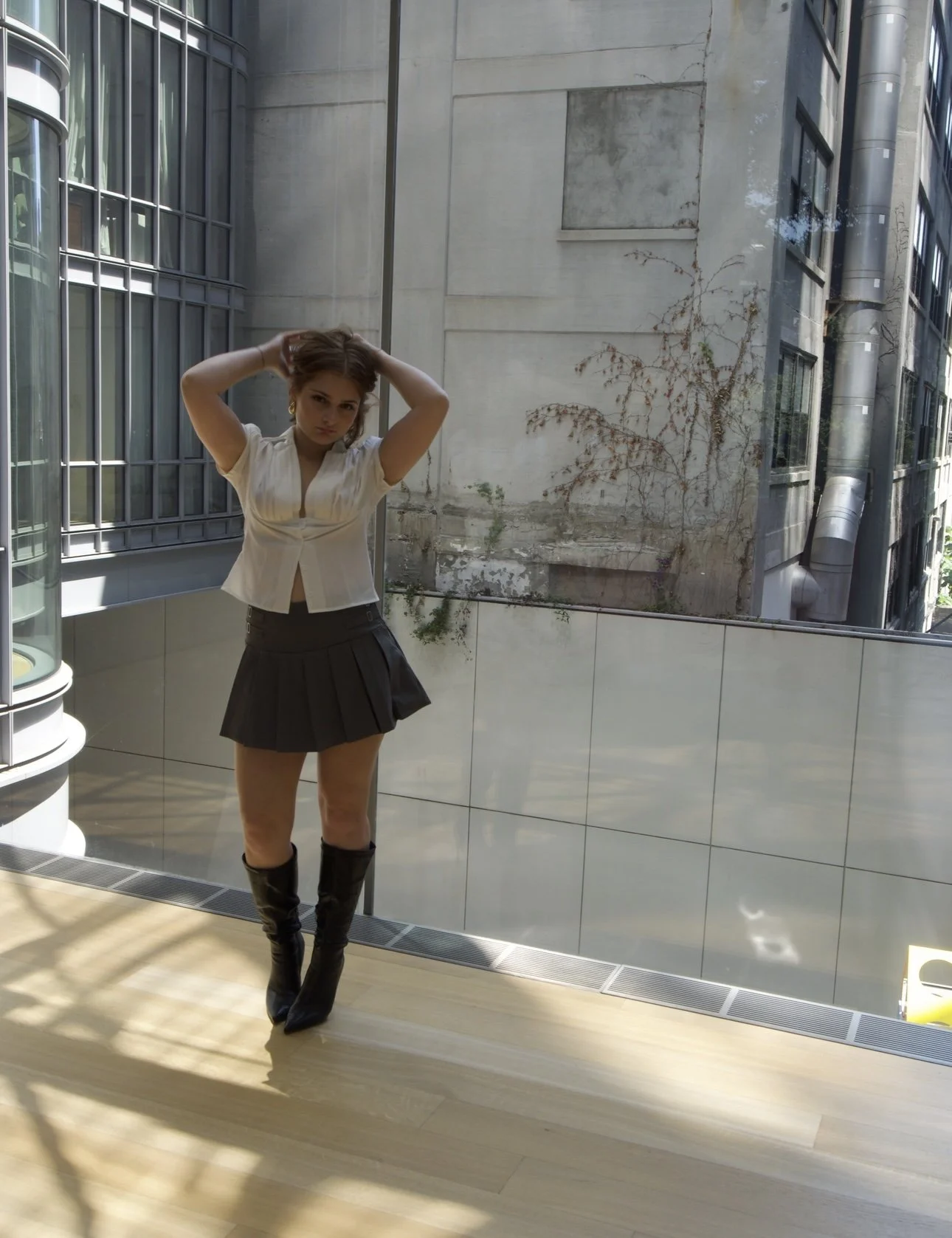 This look is both elegant and timeless, blending structured sophistication with a bold city edge. The white blouse is ruched and tailored to create a flattering, feminine silhouette. When paired with a pleated charcoal mini skirt and black knee-high heeled boot, this look becomes polished and playful.
