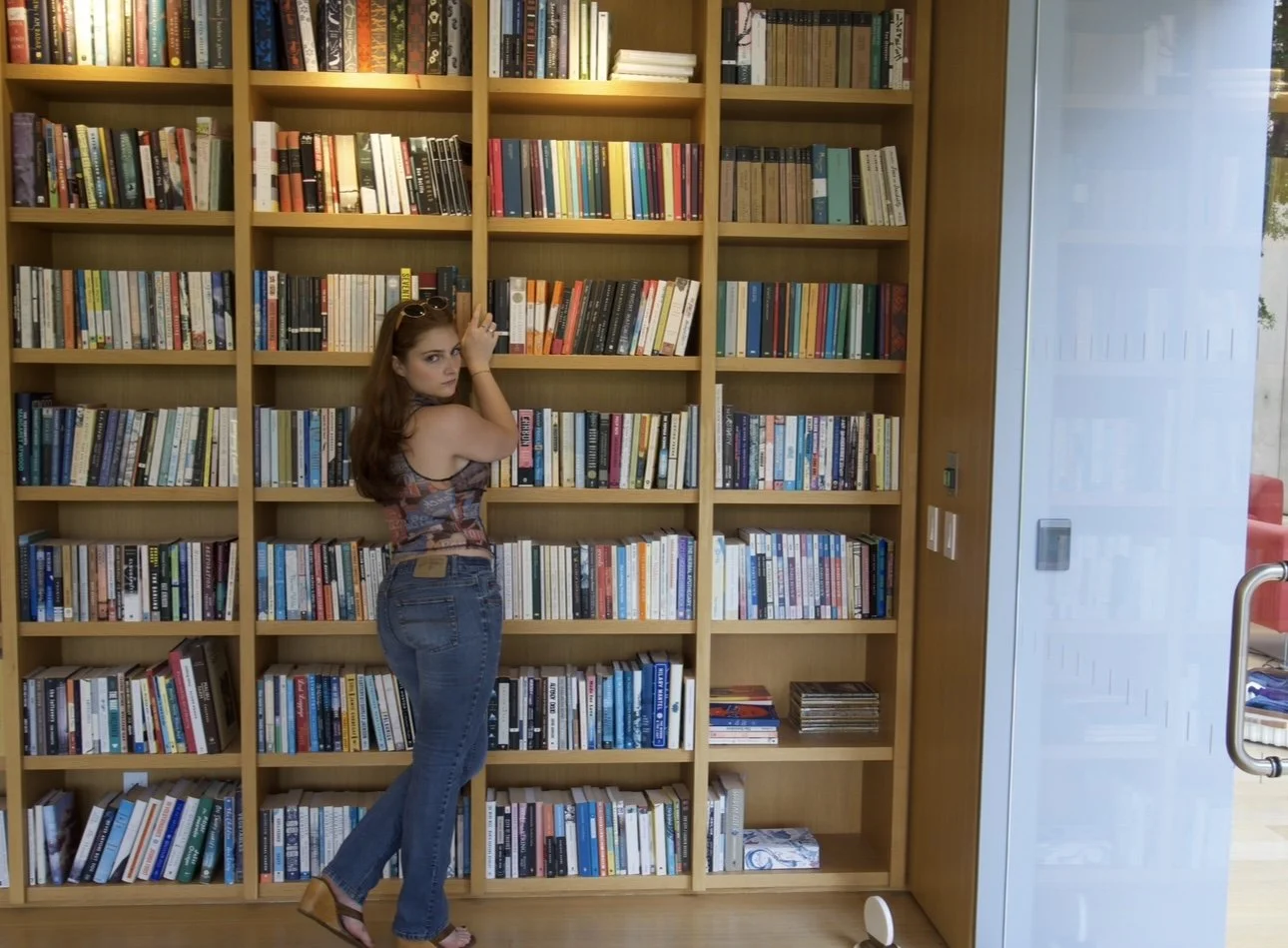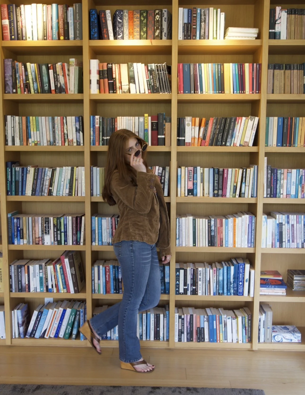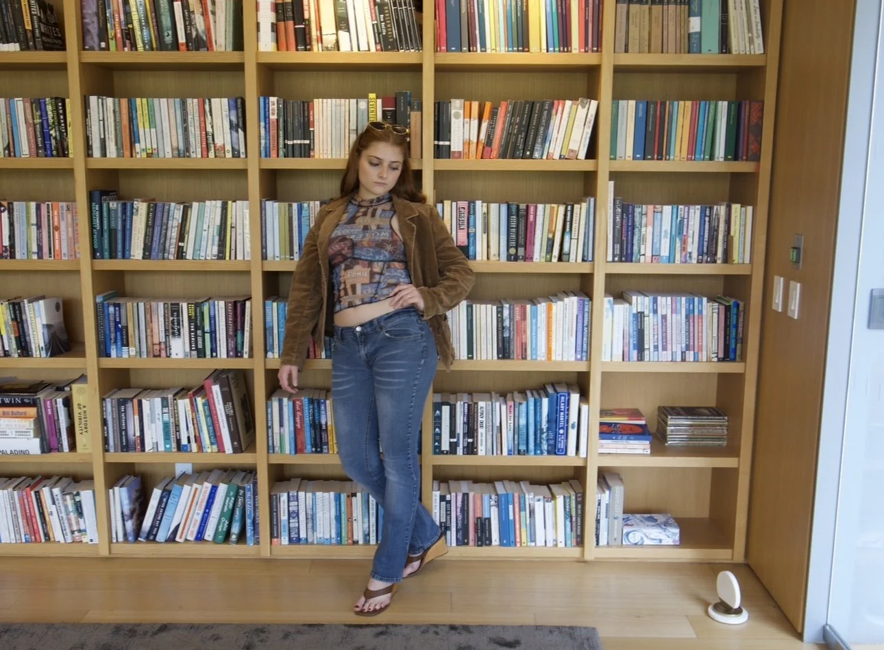 This vintage inspired look (modeled by Ruby Stanzak) captures the retro charm of the 70s. The brown tones from the rust-toned corduroy jacket, to the graphic mesh turtle neck blends vintage typography with a modern silhouette. The mid rise straight-leg jean keeps the outfit grounded, yet timeless. Finished with the vintage minimal brown heeled flip flops, this outfit creates a look effortlessly casual yet distinctly curated.