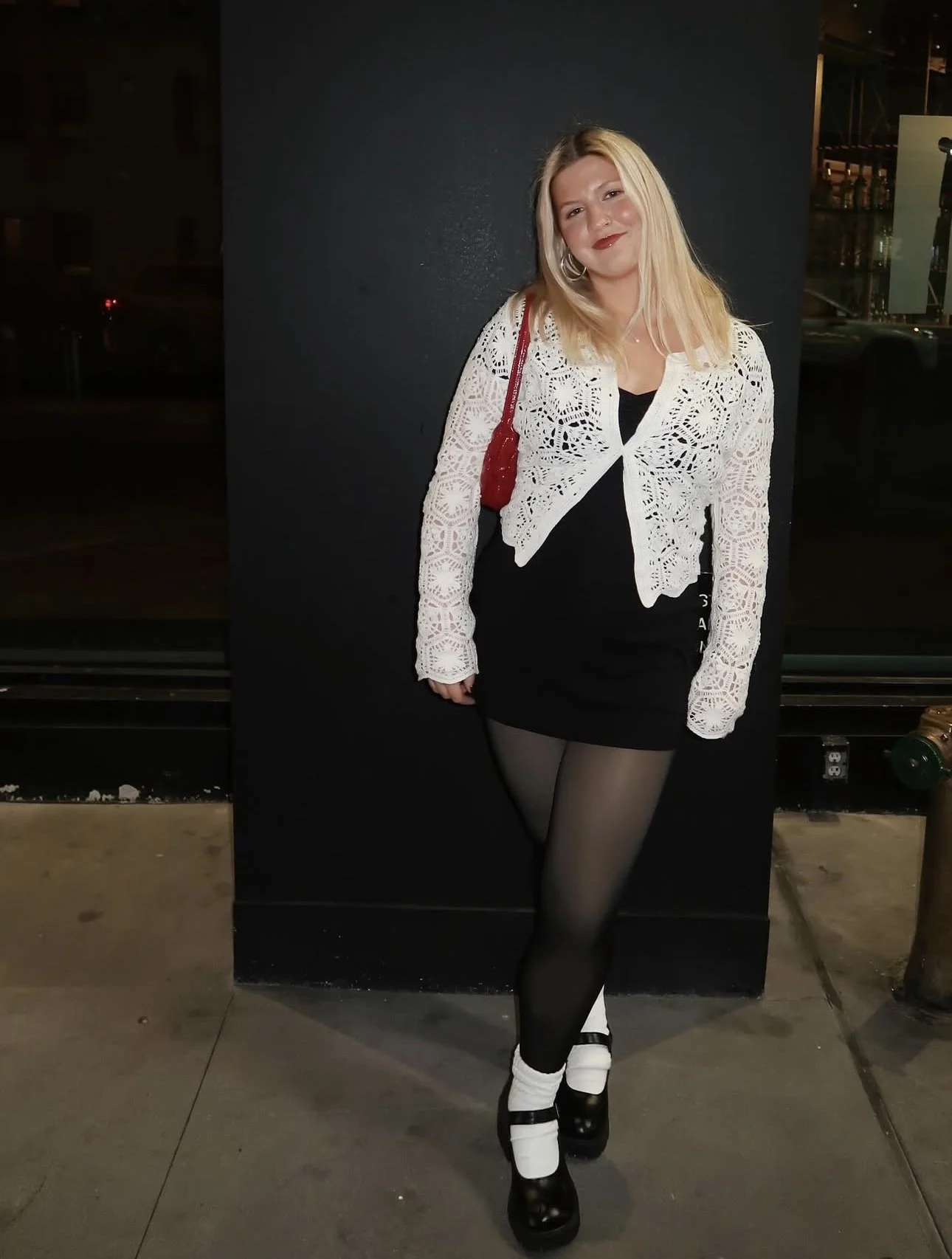 Downtown Darling blends feminine charm with a sleek city edge. A delicate white crochet cardigan layers effortlessly over a classic black mini dress, creating a striking contrast that feels both soft and bold. Black tights and a Mary Jane shoe are classic staples; adding a retro flair when paired with white socks. The red shoulder bag adds the perfect pop of color needed to finish off this confident, yet flirty night out look.